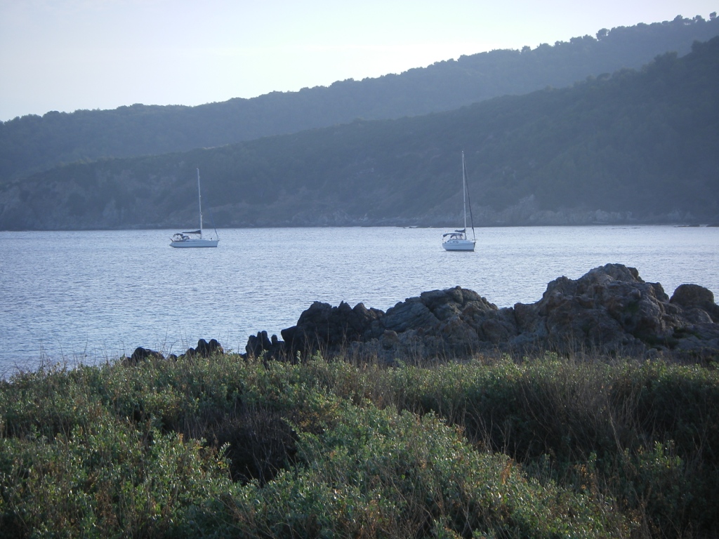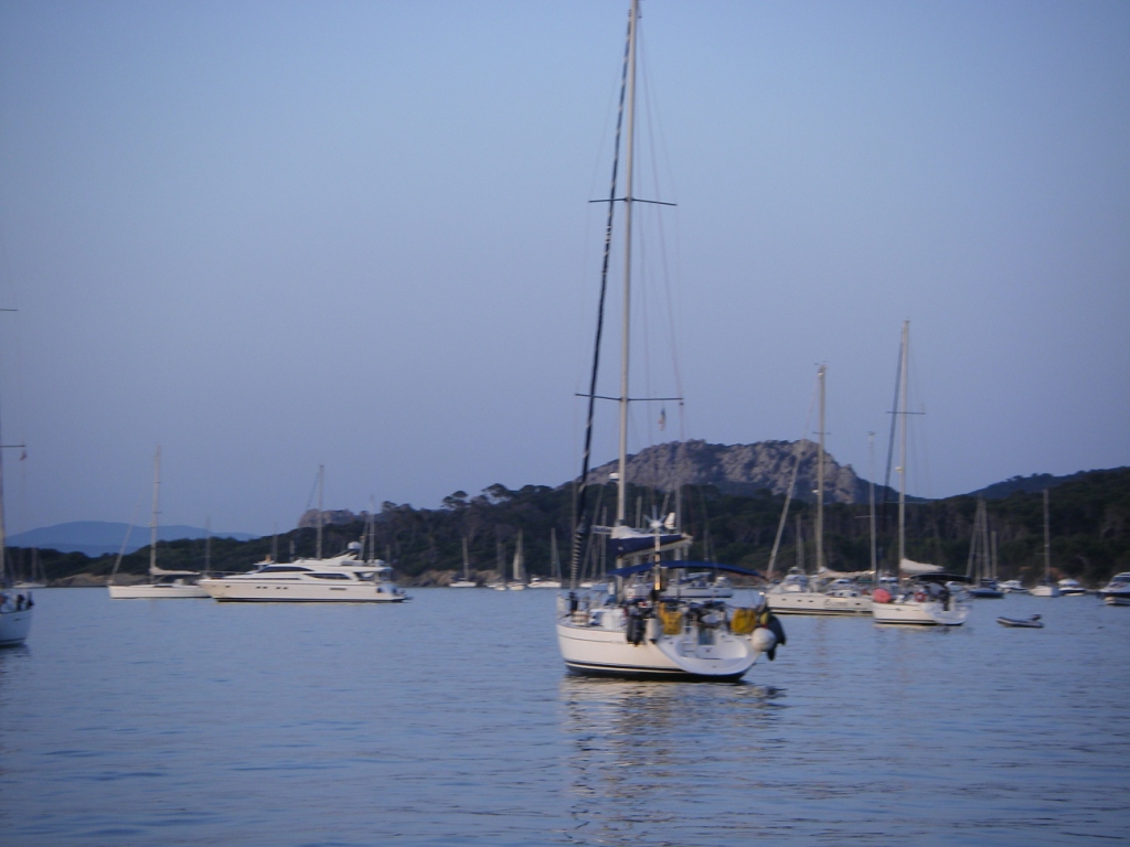 Le vent à soufflé toute la nuit, mais presque plus rien au matin, mer plate. Départ au moteur. le vent se lève . GV + Génois, direction l’île de Port-Cros. Nous tirons beaucoup de bords. Tous le monde passe à la barre. Nombreux changement de bords. La navigation est tonique. Changements fréquents de barreur, Nous passons entre Port-Cros et l'ïle du Levant, pour contourner l'île par le sud. Passe de Bagaud, et nous arrivons au port de Port Cros en fin d’après midi après. Petit tour à pied pour se dérouiller les jambes.